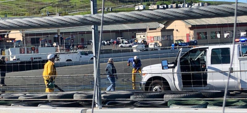 Race 7 was three classes of Miatas, with 23 taking the green, and 10 not running. Ken Sutherland/No.93 had the pole and won, but he was given a run for his money by Will Schrader/No.87, who ran a close second much of the race. Schrader led twice. They were two of the four Oregon drivers who came down, and three of them finished 1-2-3, with Eric Jones/No.73 finishing third. The fourth Oregonian, Dave Dunning/No.13, didn’t fare as well. He drove into the tires at T11 on Lap . 13. The Safety Car came out, and as the course was completely blocked by all the rescue vehicles, the pack had to be led through the infield. Turn 11 had already seen a couple of spins. There was a bit of downtime after the race to do some serious course cleanup involving the E Crew and Course Marshal, who was working alone.
